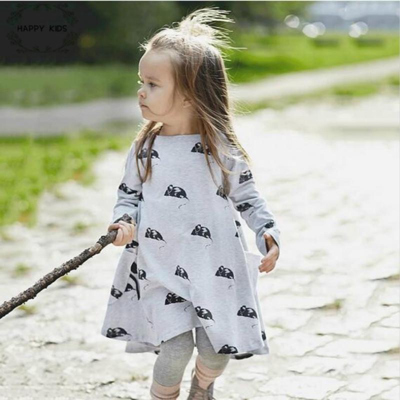 Cartoon Mouse Printed Full Sleeve Knee Length Party Dress for Kid Girls